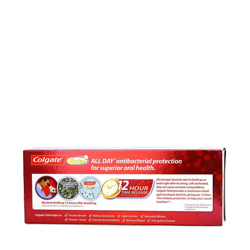 Microscopic bacteriaa start to build up on teeth right after brushing. Left unchecked, they can cause common oral problems. Colgate Total provides a continuous shield against plaque bacteria, giving you 12 Hour Time Release protection, to keep your mouth healthier*.