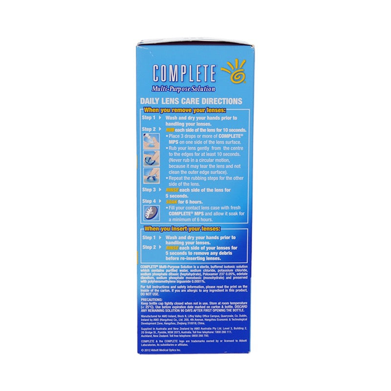 COMPLETE® Multi-Purpose Solution Easy Rub® Formula promotes disinfection by removing and killing a broad range of bacteria and microorganisms on your lenses to help protect your eyes against infection. COMPLETE® MPS Easy Rub® Formula removes protein and debris to thoroughly clean your lenses.