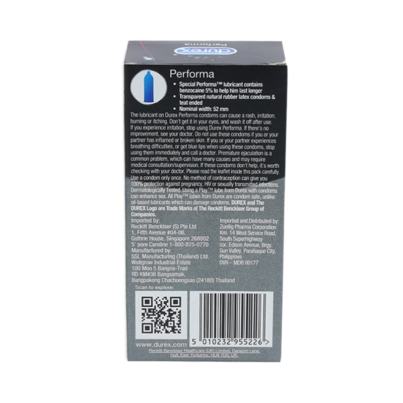 Durex doesn't just meet worldwide condom quality standards, it exceeds them, giving you the confidence to love the sex you have. 1. Nominal width 52mm. 2. Special lubricant to help last longer. Containing benzocaine 5%. 3. Transparent, lubricated and teat ended. 4. Straight walled shape. 5. The special way we make Durex Performa condoms means they smell better so there are no unpleasant distractions, you can just relax and enjoy. 6. Dermatologically tested. 7. 100% electronically tested.