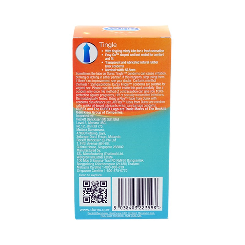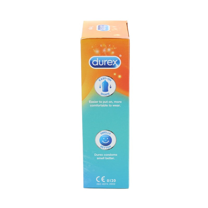 Durex doesn't just meet worldwide condom quality standards, it exceeds them, giving you the confidence to love the sex you have. 1. Nominal width 52.5mm. 2. Transparent, lubricated and teat ended. 3. Easy On shape. Durex Easy-On condoms are shaped to be easier to put on and more comfortable to wear. 4. The special way we make Durex Tingle condoms means they smell better so there are no unpleasant distractions, you can relax and enjoy. 5. Dermatologically tested. 6. 100% electronically tested.