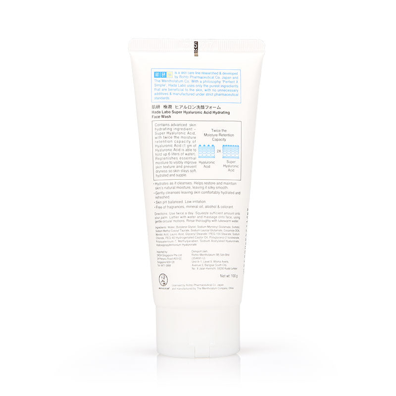 Hada Labo is a skin care line researched & developed by Rohto Pharmaceutical Co. Japan and The Mentholatum Co. With a philosophy 'Perfect X Simple', Hada Labo uses only the purest ingredients that are beneficial to the skin, with no unnecessary addictives & manufactured under strict pharmaceutical standards. Hada Labo Super Hyaluronic Acid Hydrating Face Wash hydrates as it cleanses and helps to restore and maintain skin's natural moisture, leaving it silky smooth. It gently cleanses, leaving skin comfortably hydrated and refreshed. Skin PH is then balanced with low irritation. It is free of fragrances, mineral oil, alocohol & colorant.