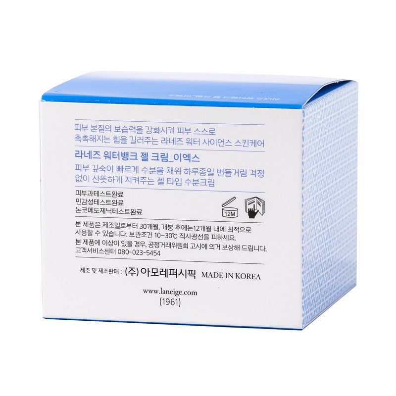 Laneige Water Bank Gel Cream is a rich moisture-boosting cream that contains mineral water to deliver intense and durable hydration for skin regeneration. Asian women feel dry on their skin despite the use of many moisturized! Why? It's because of 'thin skin barrier' Hydro Ion Mineral Water 6 types of essential minerals and 3 type of vitamins which got smaller through ionization penetrate into 20 layers of your skin! Water Pump System 4.0 It awakens moisture genes sleeping inside the skin and creates moisture by itself! Water Bank Gel Cream As soon as you put it on, it feels moist, fresh and non-greasy.
