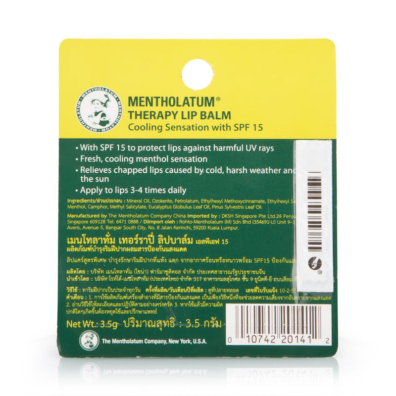 Mentholatum Therapy Lip Balm Cooling Sensation with SPF 15 has a fresh and cooling menthol sensation when applied, and comes with SPF 15 to protect lips against harmful UV rays.