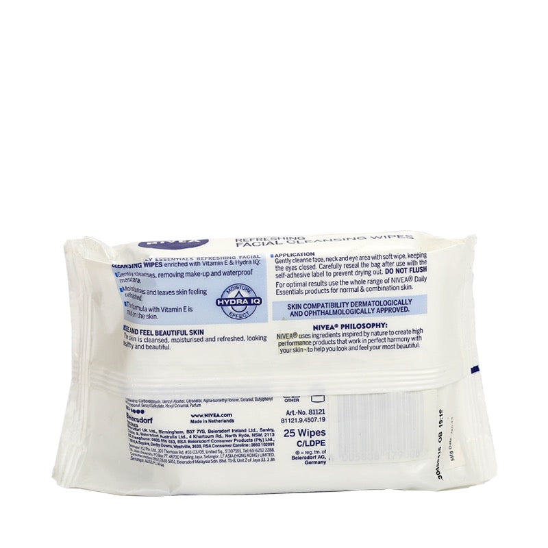 Nivea Daily Essentials Refreshing Facial Cleansing Wipes moisturises and leaves skin feeling refreshed.